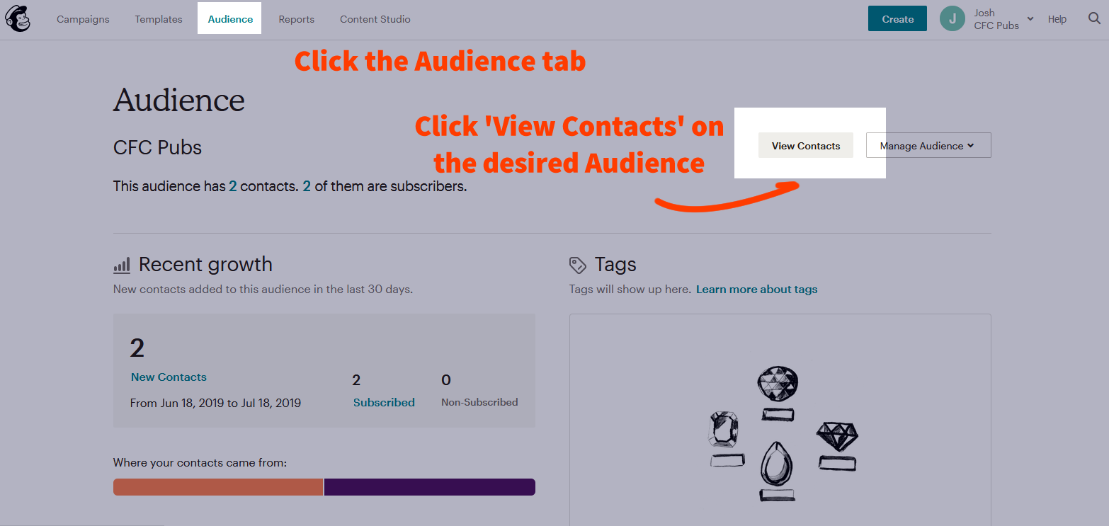 - Once the Audience page opens, click the View Contacts button for that Audience;